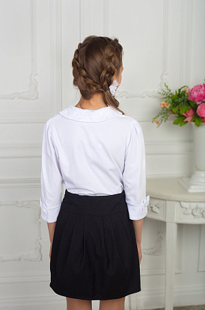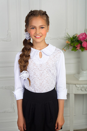 Описание: Блузка с комбинированным воротником и полочкой из ажурного трикотажного полотна,с рукавом,заканчивающимся фигурным манжетом с бантом.Рекомендована для школы.