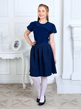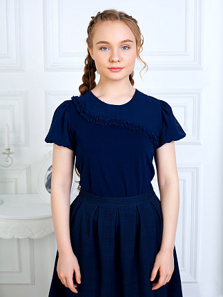 Описание: Блузка из эластичного трикотажного полотна.Короткий рукав ,кокетки и " рюш" из шифона с "жаккардовым" рисунком.Застежка на пуговицы.