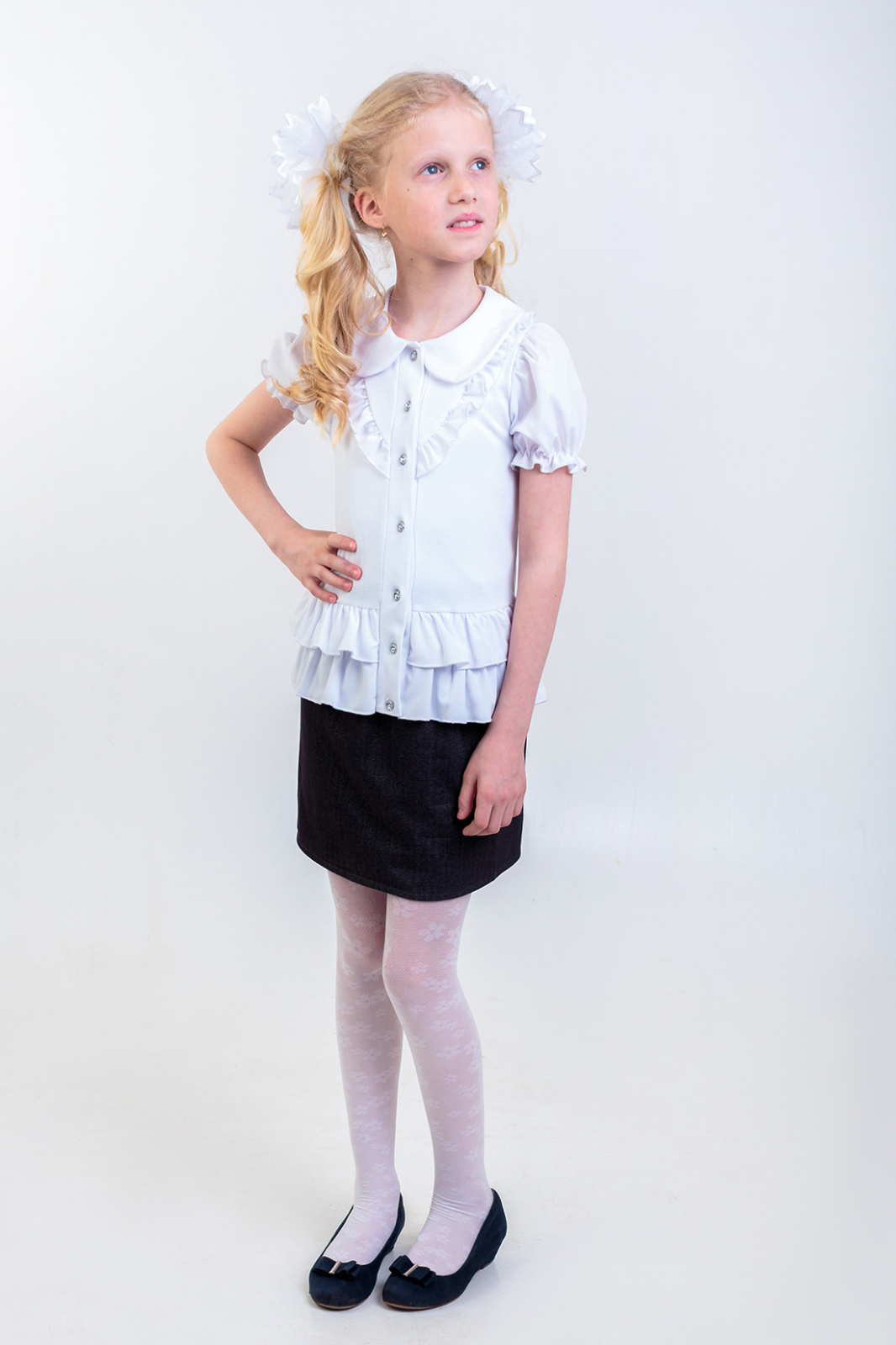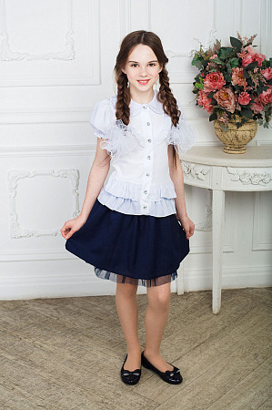 Описание: Блузка для школы и торжеств,изготовлена из интерлока,праздничный вид придают рюши и воланы из "Ниогары",рукав "фонарик " , застежка пуговицы .