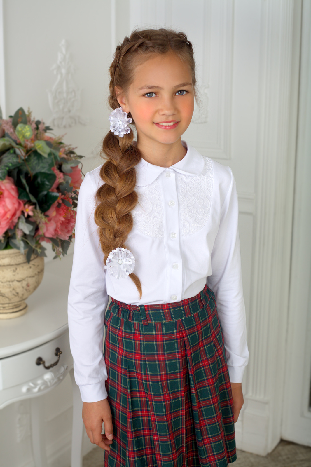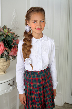 Изделие изготовлено из высококачественного трикотажного полотна,вставка из гипюра,с круглым воротничком,застежка на пуговицах.Рекомендована для школы.