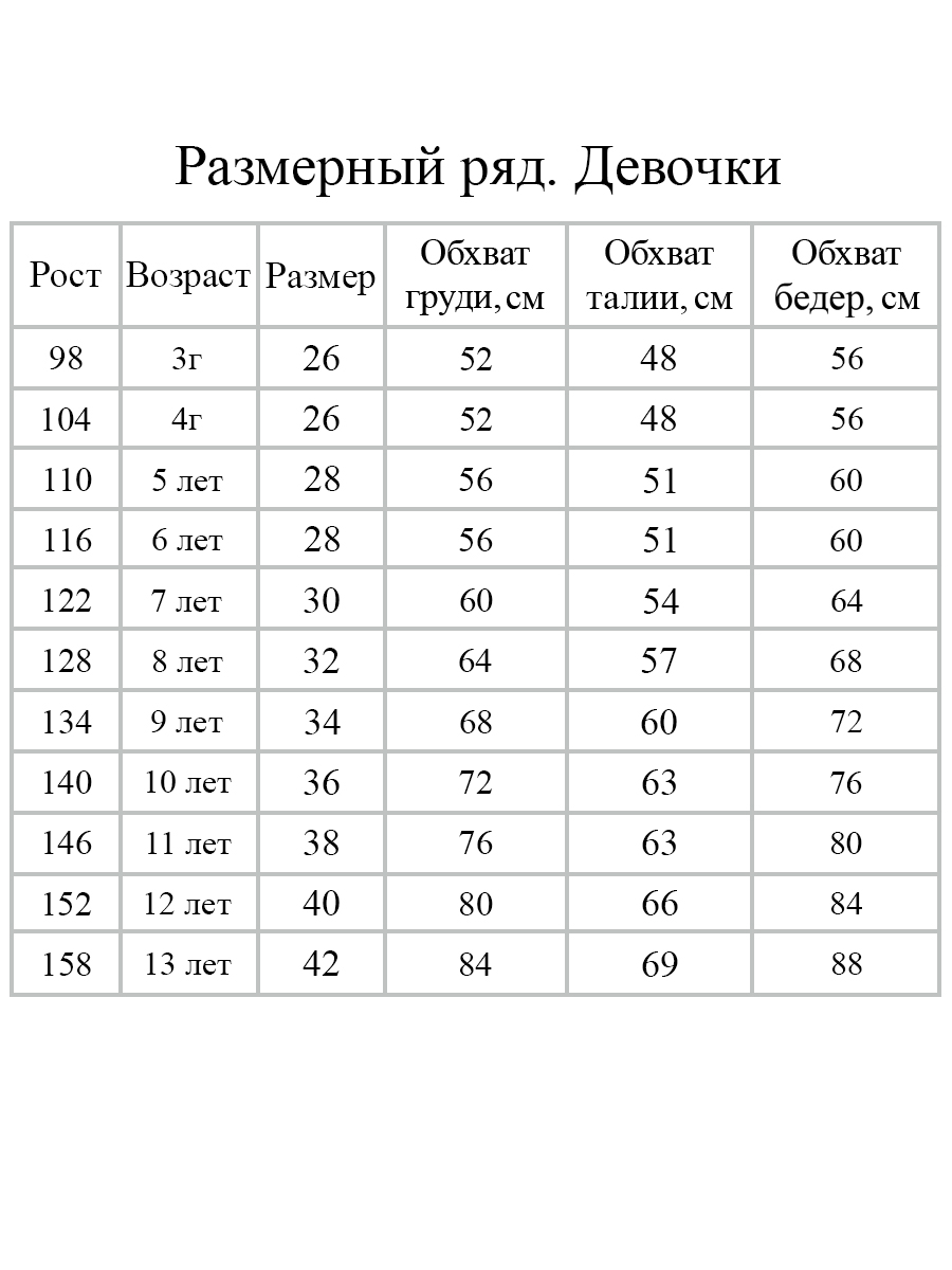 Рост Возраст Размер Обхват груди, см Обхват талии, см Обхват бедер, см