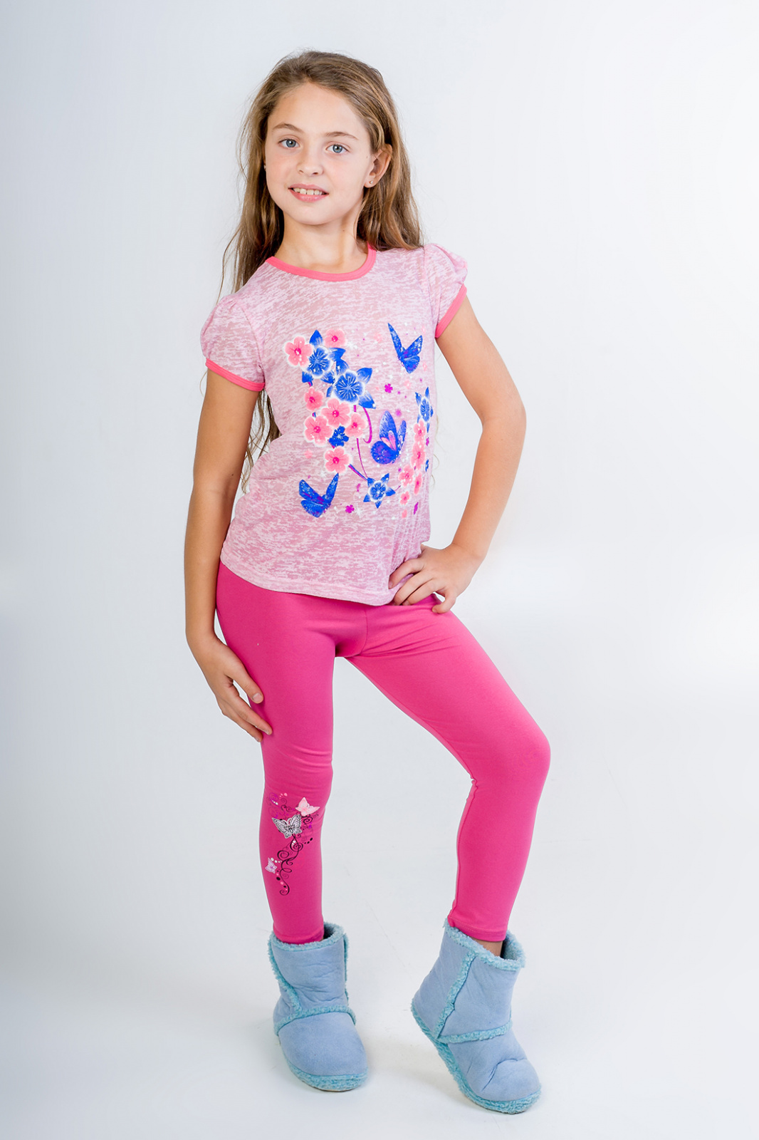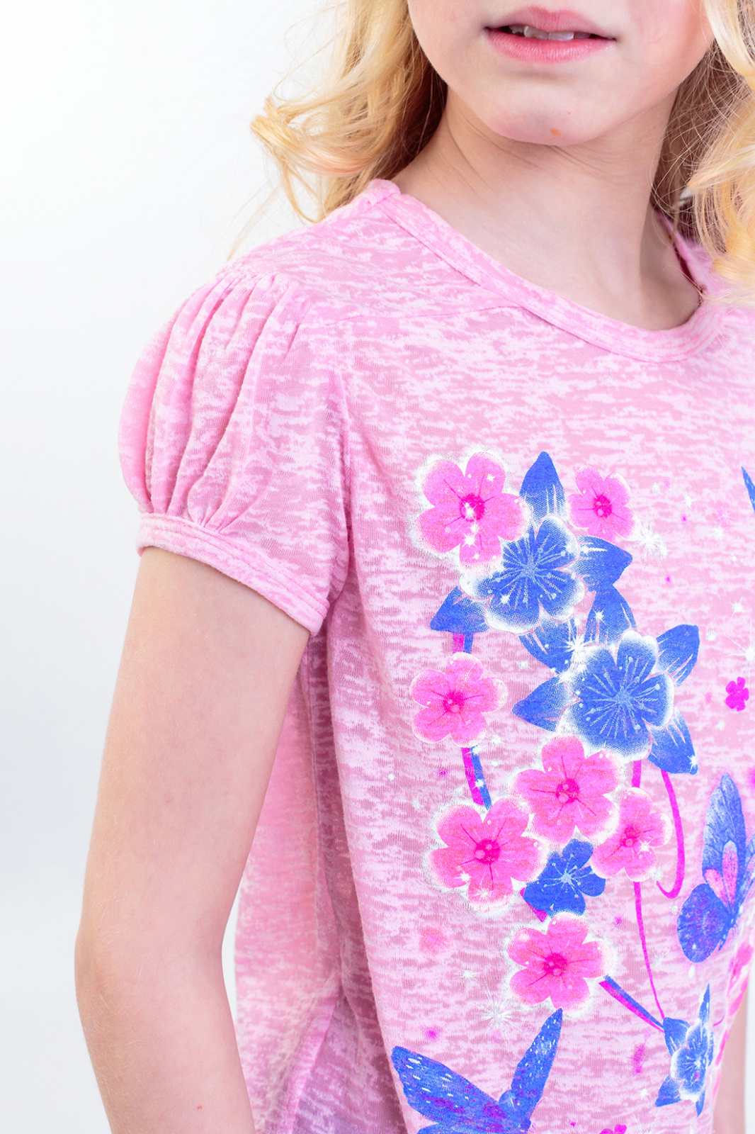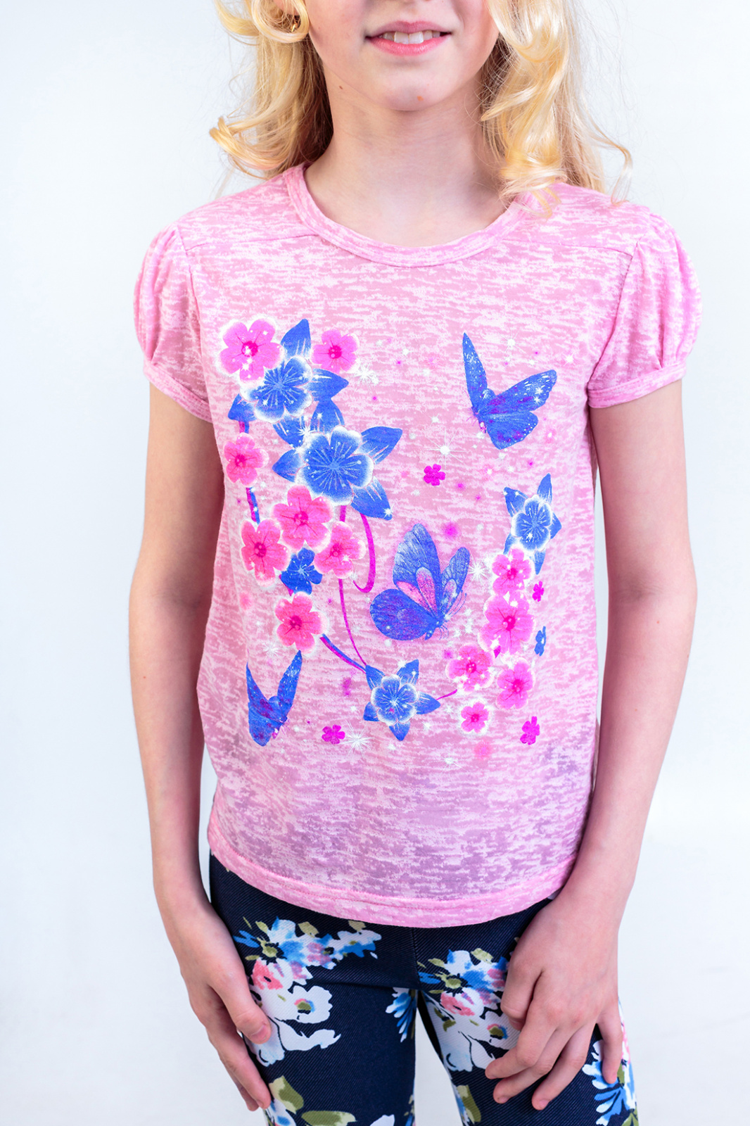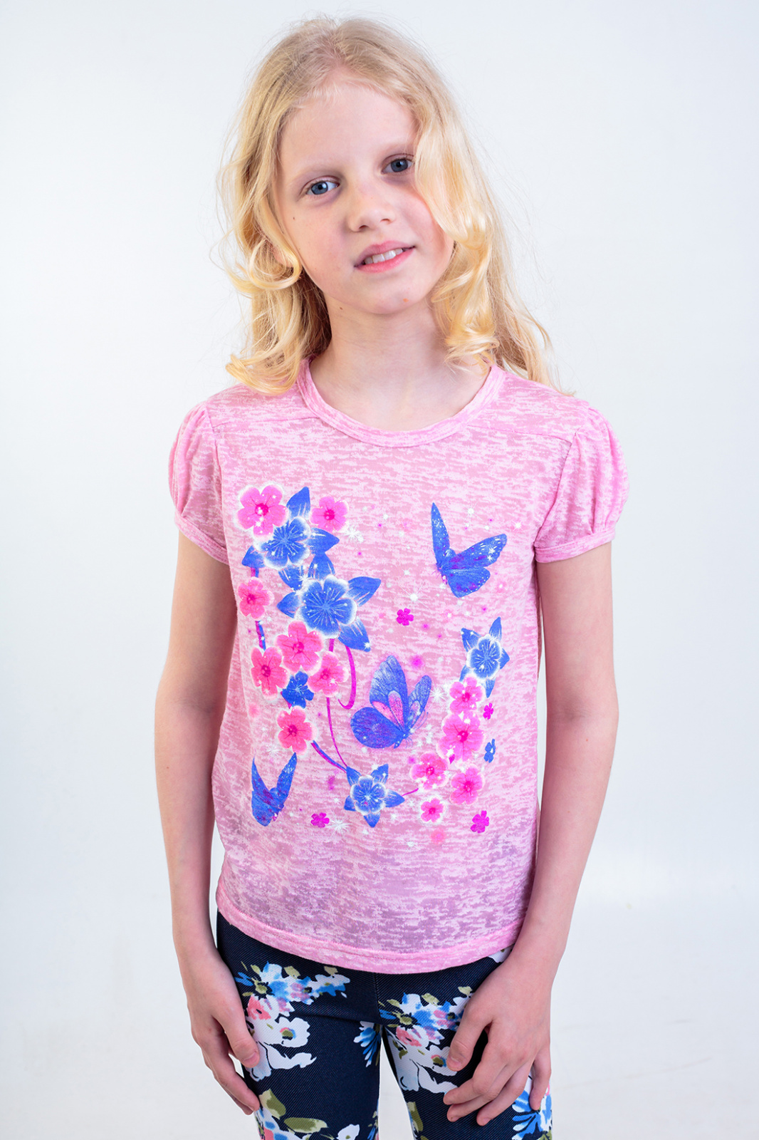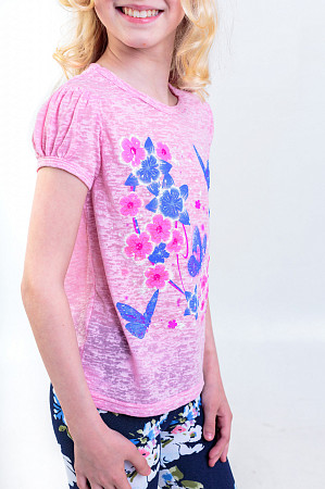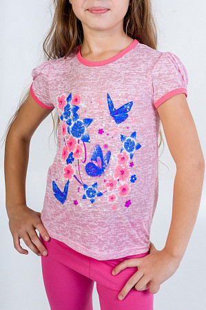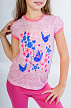 Описание: Футболка необходимая вещь в гардеробе девочки .Принт   "шелкография"- яркие цветы с бабочками удачно сочетаются с нежно-розовым цветом ткани "Деворе".Благодаря наличию искусственных волокон в ткани,изделие позволяет коже ребенка дышать.