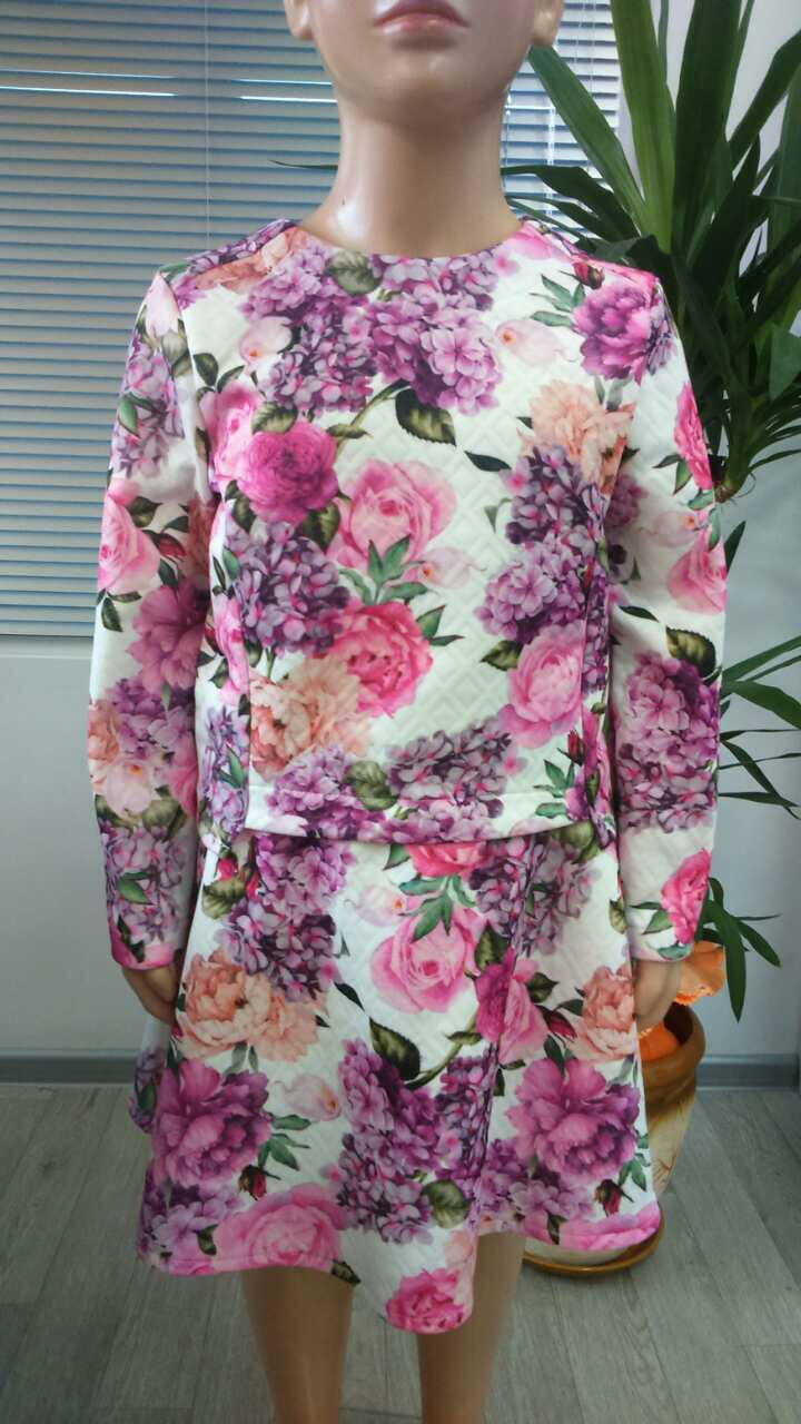 Описание: Стильный комплект из капитонии,с классическим вырезом горловины и молнией на спинке.Центральная часть полочки короче,чем спинка.Юбка "полусолнце",на резинке ,с молнией в "талию".Изделие можно носить в дополнение с футболкой,"многослойность" подчеркивает индивидуальность юной модницы.
