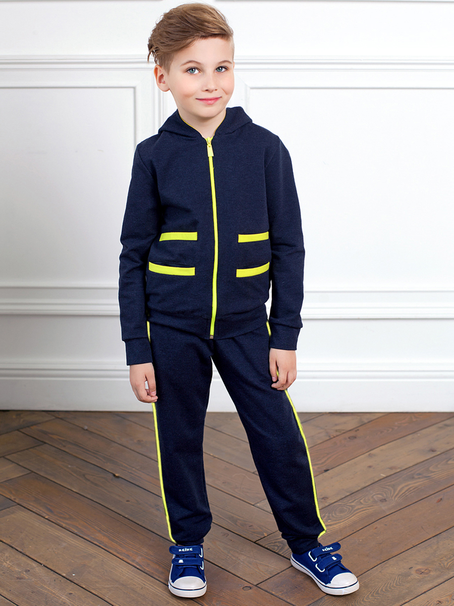 Описание: Костюм из трикотажного полотна,необходимая вещь в детском гардеробе.Яркие цвета тканей очень эффектно выглядят на темном фоне.Лампасы на кокетке и на брюках по боковым швам вносят "спортивности".